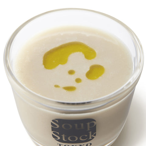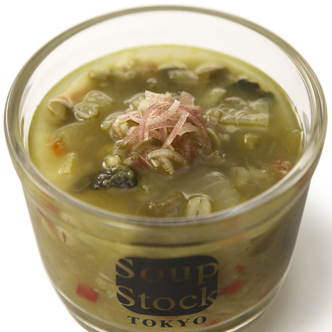 オリーブオイルで炒めた野菜のコクと旨味を昆布だしでまとめ、玉葱、キャベツ、ズッキーニ、かぶなど9種の野菜のおいしさを引き出した冷たいベジタリアンスープです。